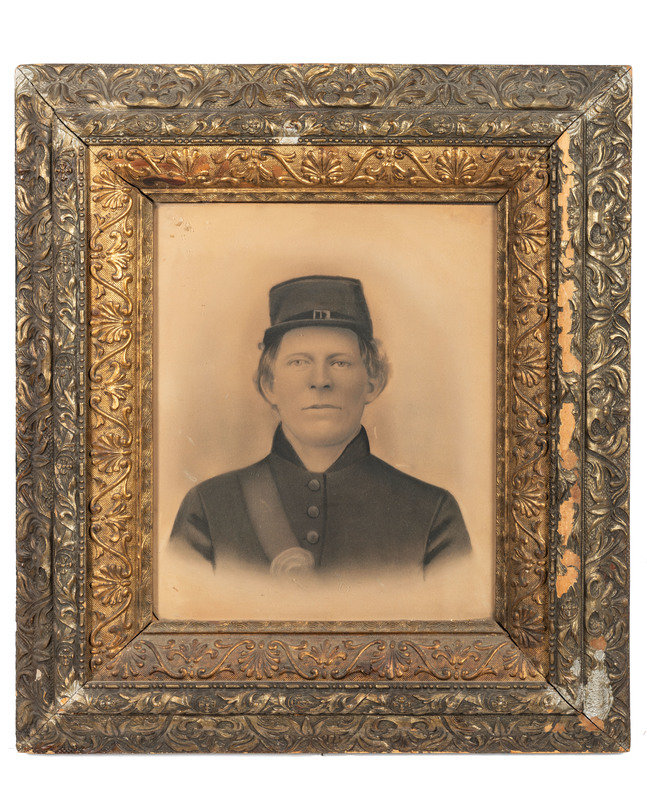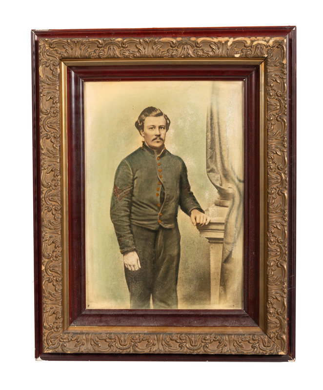 [With:] Civil War era colorized ¾ length portrait of artillery man in shell jacket (light soil, abrasions, chipping to frame). Housed in original frame. 14 x 19 1/2 in. (sight) framed to 22 x 28 in. Tag attached to frame indicates "His last name was Hibarger." -- Bust portrait of Union soldier in uniform including kepi, 13 1/2 x 18 in. (sight) framed to 24 1/4 x 28 in. (extensive wear to wooden frame). Identified on verso as "Edward Mitchell younger years." -- Oval Civil War portrait of a young soldier in uniform and armed with bayonet,14 x 20 in.