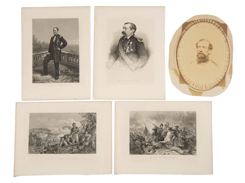 Four steel engravings, likely book plates. “Battle of Lookout Mountain, GA.” Overall print size 8.25 x 11 in., image 4.75 x 7.75 in. Engraved after a painting by John Reuben Chapin (1825-1894), engraver unknown. -- “Battle of Gettysburg.” Possibly mistitled. Overall 8.25 x 11 in., image approx. 5 x 7.5 in. By F.O.C. Darley and W. Ridgway. -- “Genl . P. H. Sheridan” steel engraving ca. 1885. Overall 8.25 x 11 in., image approx. 5.75 x 7 in. -- “Genl. W. T. Sherman” steel engraving. Overall 8 x 11 in., image approx. 5.5 x 7.75 in. All engravings with toning at edgelines and minor soil but condition generally good.