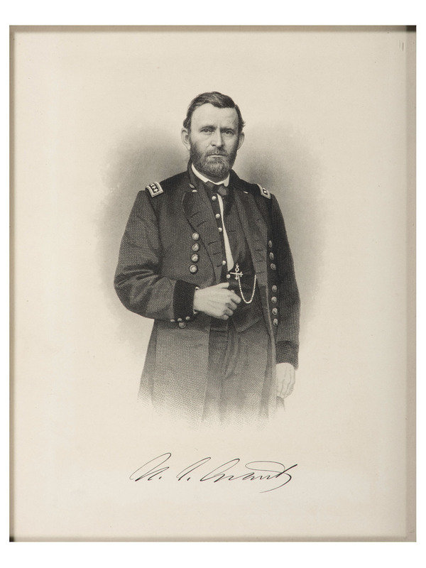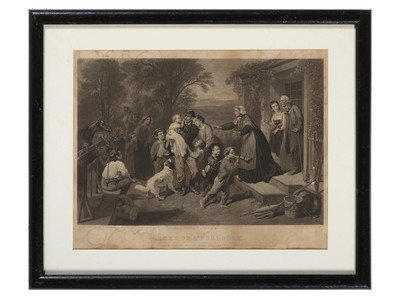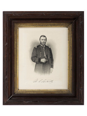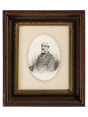 Late 19th century print of U.S. Grant as a general, 7.75 x 9.75 (sight), framed to 12.5 x 14.25 in. (minor scratches on frame, print good but not removed from frame for inspection). -- Late 19th century print of General Robert E. Lee, 7.75 x 9.75 (sight) framed to 12.25 x 14.25 in. (minor scratches on frame, print good but not removed from frame for inspection). -- Engraving by John Sartain of Philadelphia, after original painting “Home on a Furlough” by C. Schussele, 1864. 16 x 12.26 (sight), framed to 21.5 x 17.5 in (scratches to frame, image heavily toned, dampstaining, loss to right side).