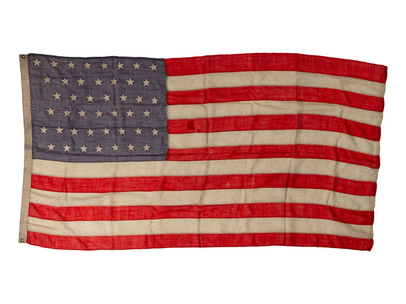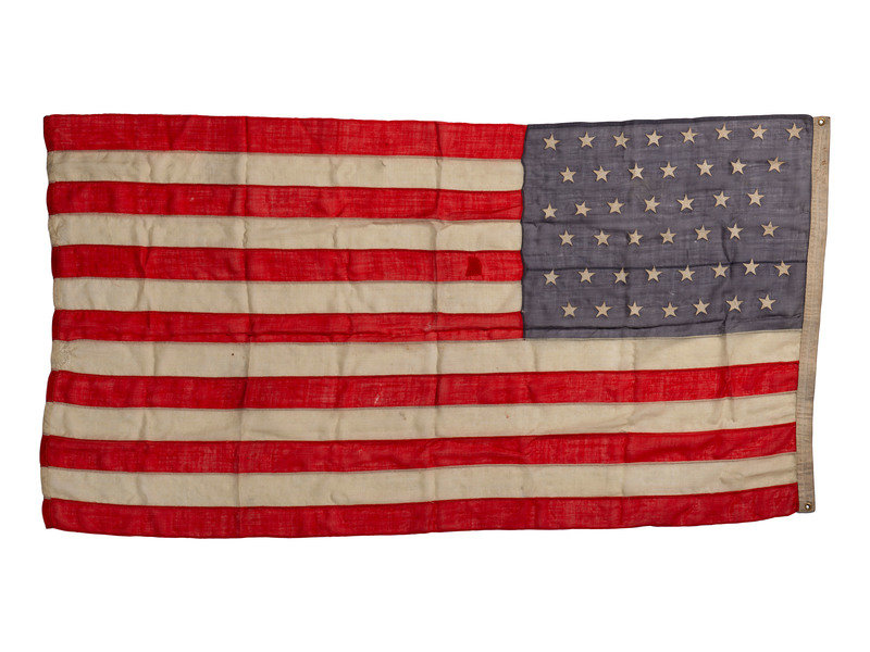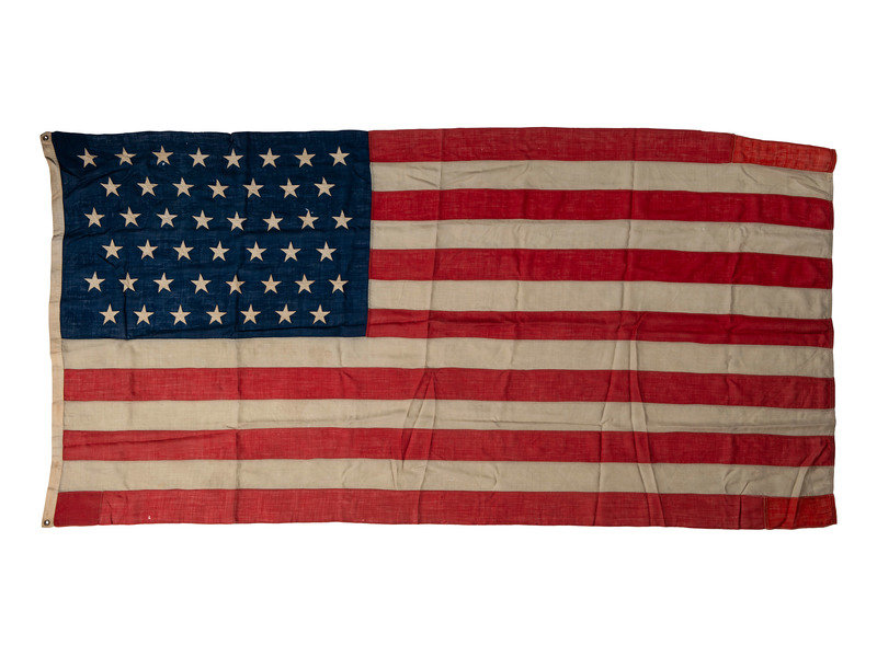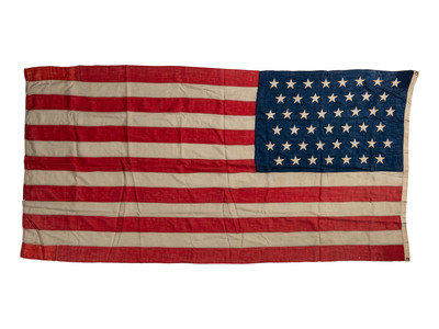 [With:] 45 star US flag (c. 1896-1908). Wool stripes and canton. 58 x 114 in. Machine-sewn double appliqued cotton stars in 7-8-7-8-7-8 pattern. Cotton duck hoist. Brass grommets. (scattered mothing with a few repairs, replaced fabric at both fly corners [red])
