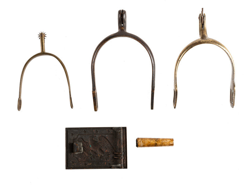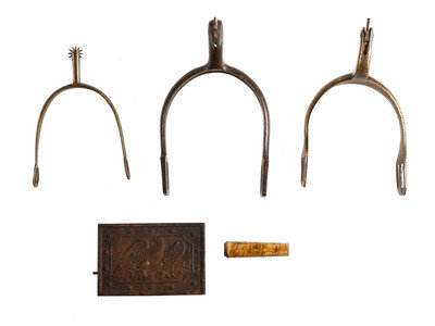 [CIVIL WAR] Miscellaneous accoutrements, including spurs, shoulder straps, militia buckle and 5-second fuse.