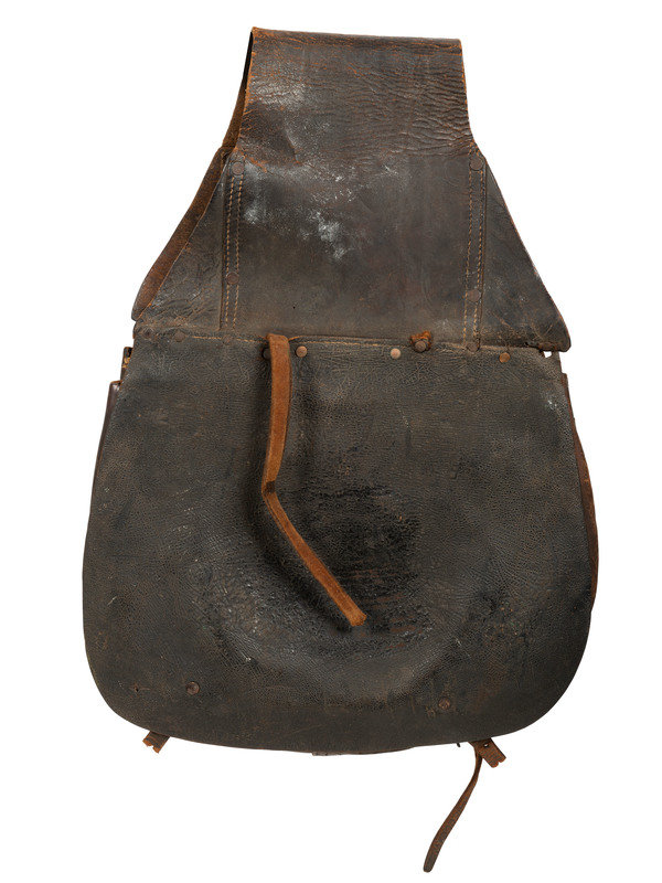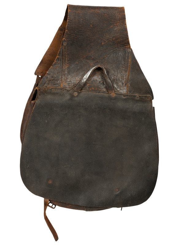 [Also with:] Leather saddlebags. N.p., late 19th/20th century. Approx. 14 1/2 x 42 in. leather saddlebags (white residue, straps missing). Larger than Civil War-period.