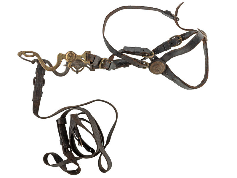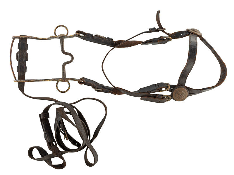 Civil War-era leather, brass, and metal artillery set. N.p., 19th century. Bridle has brass entwined “USA” side rosettes and correct early brass-faced D-buckles. Rare reins have correct 2-section type buckle. Black leather of bridle and reins are in excellent shape. Bit is the 1863 version with brass face and lead-filled USA rosettes. There is a "US" stamp on each side plate on mouth bar. Bit is complete. (Some cracking to leather with one split, otherwise excellent condition.)
