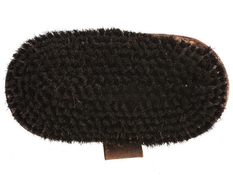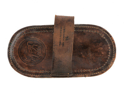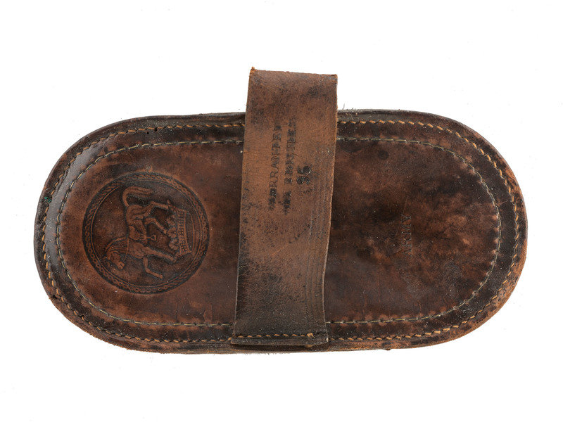 [With:]: Horse brush. N.p., ca late 19th/early 20th century. 4 1/8 x 8 1/2 in. leather horse brush. Stamped "Army" alongside horse and crown design. Leather strap intact and stamped "Warranted All Bristles 95."