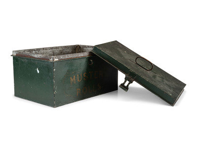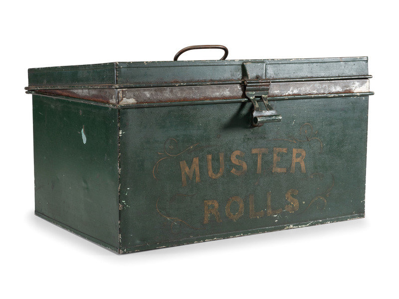 Tin muster roll box with original green paint, approx. 18 1/4 x 20 1/4 x 20 3/4 in. (scratches, paint loss, corrosion especially in box interior). Front stenciled "Muster Rolls" identification and interior of lid stamped near center "Co. A, 19th, Me. Reg't."