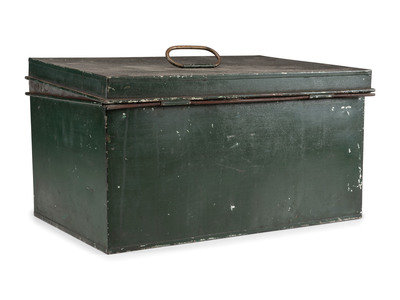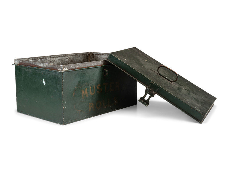 [CIVIL WAR] -- [MAINE]. Tin muster roll box identified to Co. A, 19th Maine Regiment, accompanied by stage trunk identified to Maine manufacturer.