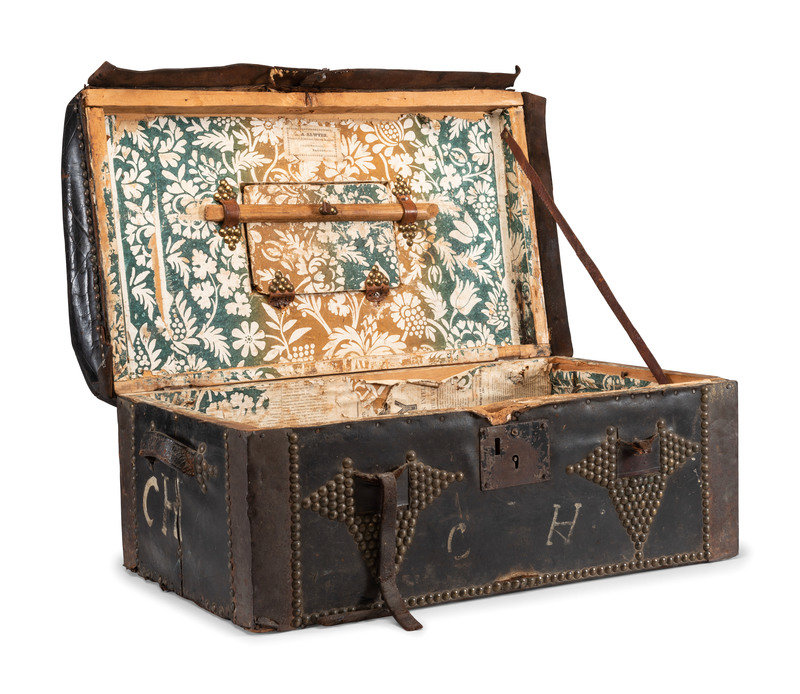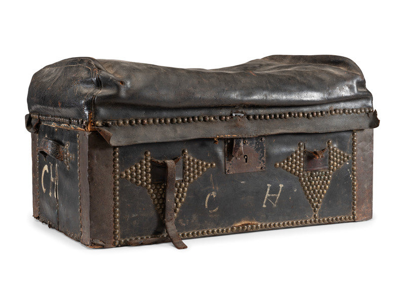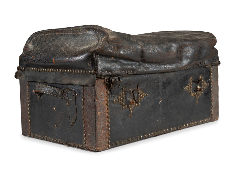 [With:] 19th-century stage trunk of leather and wood with brass stud ornamentation, 14 x 24 x 13 in. Interior lined with vintage newspapers and decorative paper. (Cracking to leather, losses to interior linings and brass studs, only one retaining strap for opening remains.) Interior label by maker "[AS]A SAWYER / Saddle, Harness, Trunk Maker / and / Chaise-Trimmer / Bangor, (Me.)"
