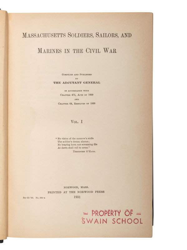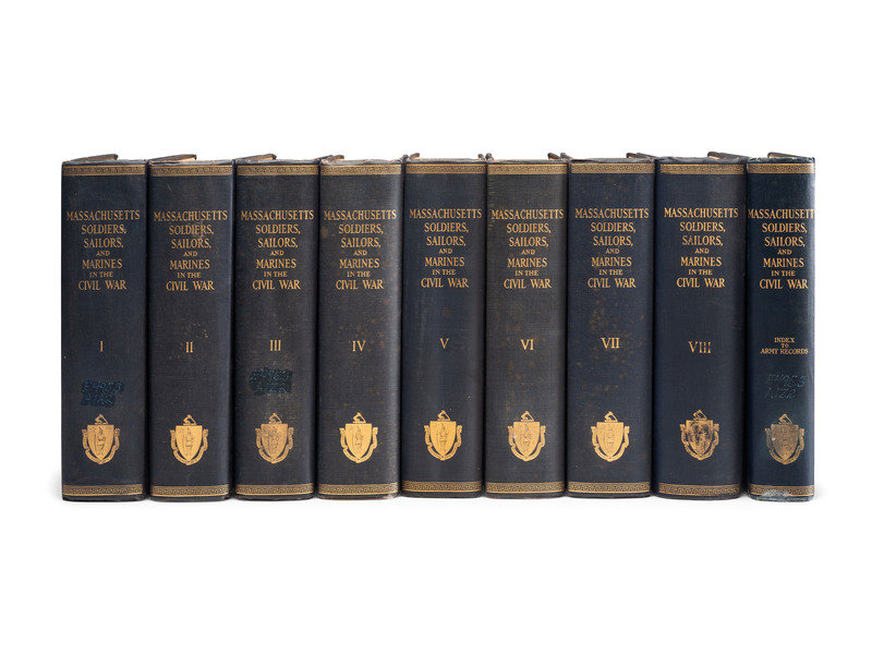 Massachusetts Soldiers, Sailors, and marines in the Civil War. Norwood, MA: The Norwood Press, 1931-1937. 9 volumes. 8vo. Charts. (Some toning.) Publisher's blue cloth gilt (minor wear to extremities). Provenance: New Bedford Institute of Technology (library markings); Swain School (library stamp).