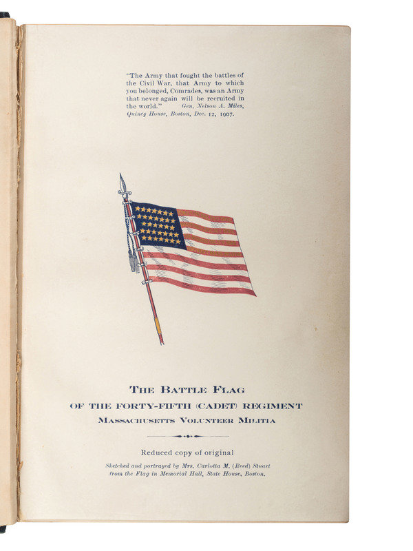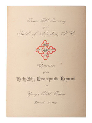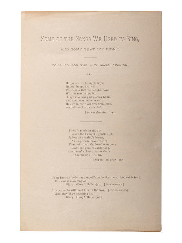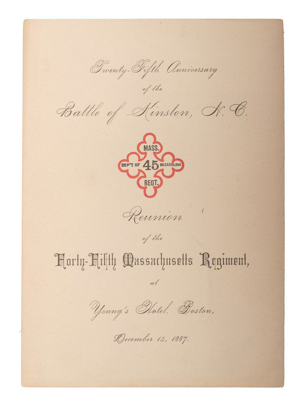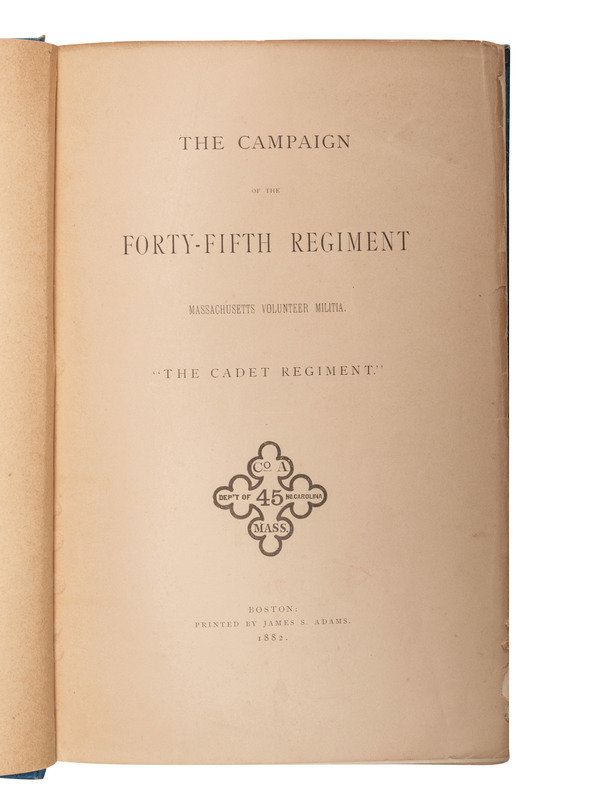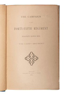 [With:] The Campaign of the Forty-Fifth Regiment Massachusetts Volunteer Militia. "The Cadet Regiment." Boston: James S. Adams, 1882. -- MANN, Albert W. History of the Forty-Fifth Regiment Massachusetts Volunteer Militia. [Massachusetts]: N.p., [1908]. (Lacking title page.) -- Some of the Song We Used to Sing, And Some That We Didn't. Compiled for the 45th Mass. Reunion. N.p.: N.p., [1907?]. -- Twenty-Fifth Anniversary of the Battle of Kinston, N.C. Reunion of the Forty-Fifth Massachusetts Regiment. [Boston?]: N.p., 1887. -- Together, 4 works (2 books and 2 pamphlets) related to the 45th Massachusetts, 8vo, condition generally very good except as noted.