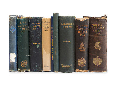 [Also with:] BOWEN, James L. Massachusetts in the War. Springfield, MA: Clark W. Bryan & Co., 1889. -- PARKER, John L. and Robert. G. Carter. Henry Wilson's Regiment. History of the Twenty Second Massachusetts Infantry, the Second Company Sharpshooters, and the Third Light Battery. Boston: Regimental Association, Rand Avery Company, 1887. (Front hinge broken, title page loose.) -- TYLER, Mason Whiting. Recollections of the Civil War with many Original Diary Entries and Letters Written from the Seat of War, and with Annotated References. New York and London: G.P. Putnam's Sons, The Knickerbocker Press, 1912. Dust jacket. -- BARDEEN, Charles William. A Little Fifer's War Diary. Syracuse, NY: C.W. Bardeen, 1910. Provenance: Wisconsin Historical Society (library stamps). -- First Regiment of Infantry Massachusetts Volunteer Militia. Boston: Wright and Potter, Commonwealth of Massachusetts, 1903. -- And 2 others. Together, 7 works in 7 volumes, 8vo, all in publisher's bindings, condition generally good, except as noted.
