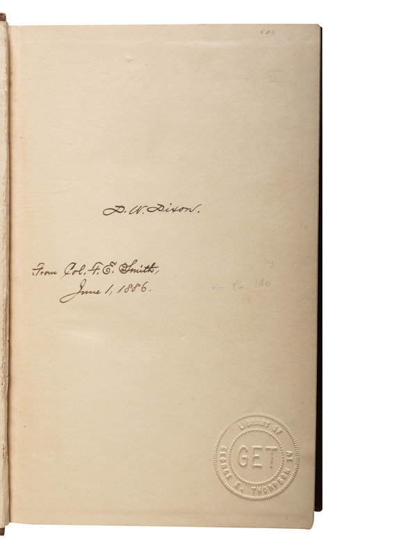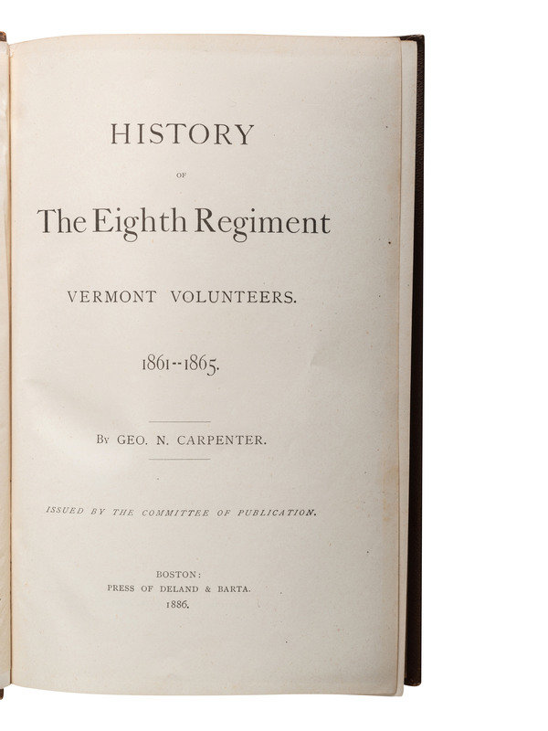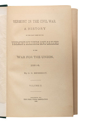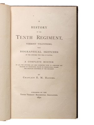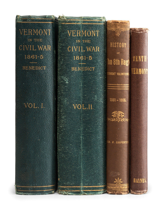 HAYNES, Edwin M. A History of the Tenth Regiment, Vermont Volunteers. Lewiston, ME: Tenth Vermont Regimental Association, 1870. Sabin 31049. -- CARPENTER, George N. History of the Eighth Regiment Vermont Volunteers. Boston: Deland & Barta, 1886. Provenance: George E. Thompson IV (blindstamp to flyleaf). -- BENEDICT, G.G. Vermont in the Civil War. A History of the Part Taken by the Vermont Soldiers and Sailors in the War for the Union. Burlington, VT: The Free Press Association, 1886. 2 volumes. -- Together, 3 works in 4 volumes, all FIRST EDITION, 8vo, all in publisher's cloth bindings, condition generally very good.
