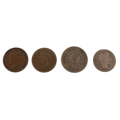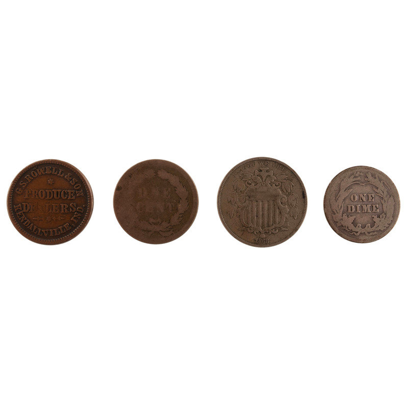 [With:] 1851 wheat penny (raised surfaces very worn, parts of legend unreadable). -- 1868 shield nickel (soiling and discoloration in places, with lighter wear to raised surfaces). -- 1863 G.S. Rowell & Son, Produce Dealers, store token. Kendallville, IN (soiling and darkening to edges/ridges, partial store name legend worn down to surface).