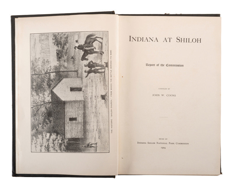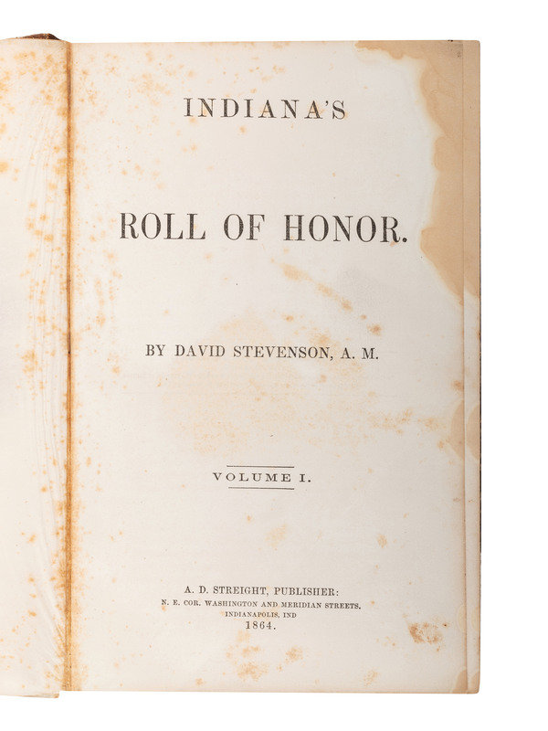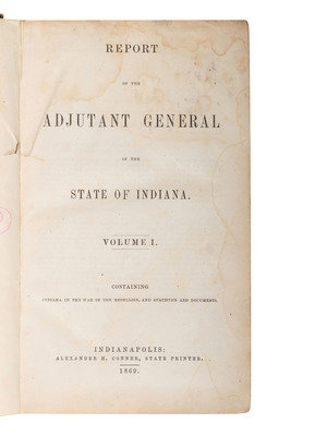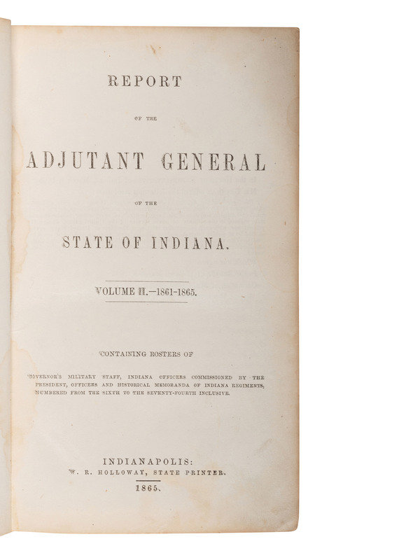 [With:] STEVENSON, David. Indiana's Roll of Honor. Indianapolis: A.D. Streight, 1864. 2 volumes. (Heavy wear to spines and joints, tape repair to volume II.) -- COONS, John W., compiler. Indiana at Shiloh: Report of the Commission. Indianapolis: Indiana Shiloh National Park Commission, William B. Burford, 1904. -- History of Dearborn, Ohio and Switzerland Counties, Indiana. Chicago: Weakley, Harraman & Co., 1885. -- Together, 3 works in 4 volumes, all FIRST EDITION, 8vo, all in publisher's bindings, condition generally good, except as noted.