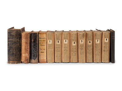 9 volumes (of 8, 2 copies of vol. III), 8vo. Charts and tables. (Occasional loose gatherings, wear to edges, occasional toning, volume VIII lacking preliminaries.) Original publisher's illustrated brown cloth gilt (all volumes lacking spines and rebacked with modern handwritten spine labels); second copy of volume III bound in full leather (lacking spine, with tape repair and hand-written spine label).