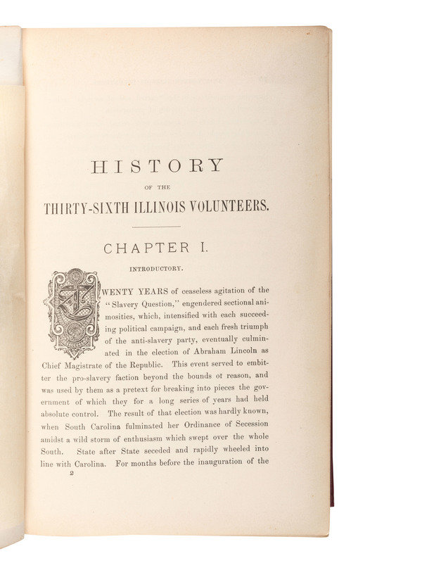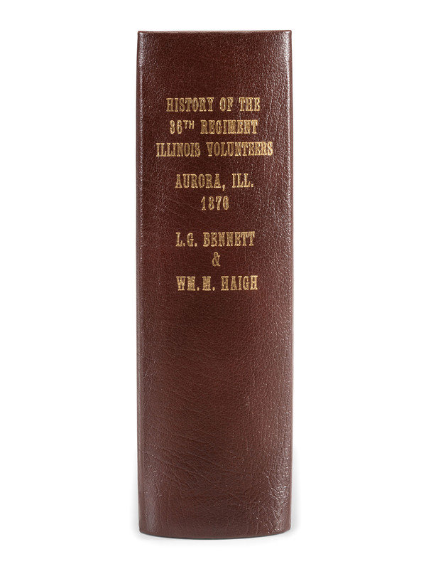 FIRST EDITION regimental history of the 36th Illinois Infantry. The regiment fought at several major battles including Pea Ridge, Stones River, Chickamauga, Atlanta, Kennesaw Mountain, Franklin, and Nashville. Written by two veterans, Lyman G. Bennet (b. ca 1831) enlisted on 1 August 1861 at Bristol, IL as a corporal and was mustered into Company E of the 36th Illinois on 20 August 1861. he was transferred into 1st Arkansas Cavalry (Union) on 5 December 1863. William M. Haigh (b. ca 1829) enlisted on 18 August 1862 as a chaplain and was commissioned into Field & Staff on 11 October 1862, resigning on 16 May 1864. RARE: no copy ever sold at auction, OCLC locates only 1 copy.
