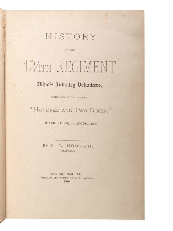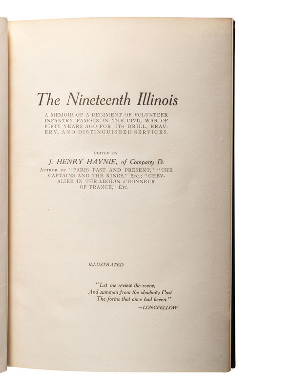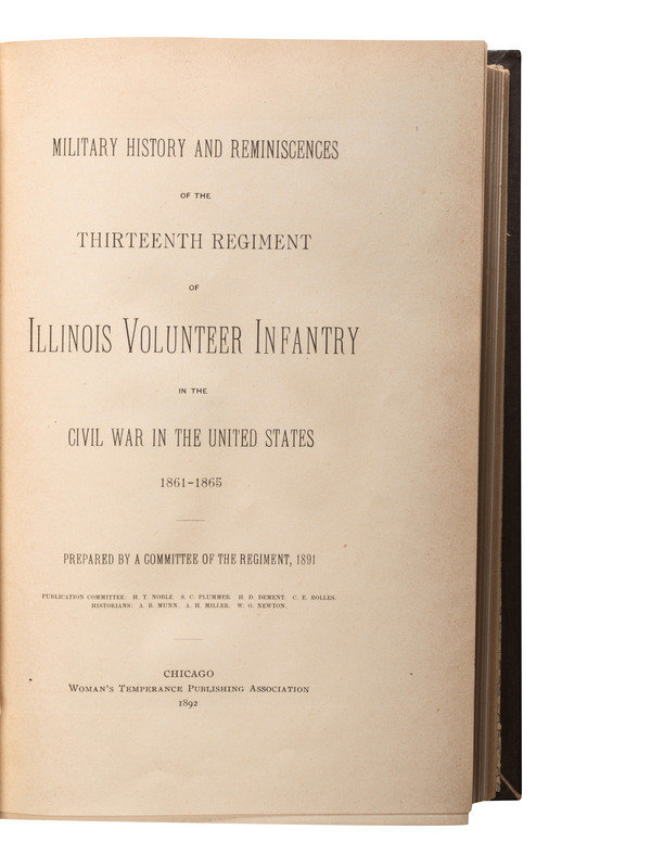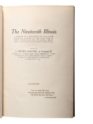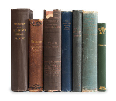 HOWARD, Richard L. History of the 124th Regiment Illinois Infantry Volunteers Otherwise Known as the "Hundred and Two Dozen." Springfield, IL: H.W. Rokker, 1880. Howard enlisted on 1 July 1863 as a chaplain and was commissioned into the 124th IL on 9 September. Mustered out 15 August 1865. -- Military History and Reminiscences of the Thirteenth Regiment of Illinois Volunteer Infantry. Chicago: Women's Temperance Publishing Association, 1892. -- HAYNIE, J. Henry (d. 1912), editor. The Nineteenth Illinois. Chicago: M.A. Donohue & Co., 1912. Haynie enlisted on 17 June 1861 as a corporal and was mustered into Company D of the 19th IL on the same day. Mustered out on 9 July 1864 in Chicago and was a member and post commander of GAR Post #62 (Charles Ward) in Newtonville, MA. -- Report of the Adjutant General of the State of Illinois. Springfield: Baker, Bailhache & Co., 1867. Vol. VIII only. Covering 4-17 Cavalry, 1 & 2 regiments and batteries of artillery, colored troops; first army corps. -- BRYNER, Cloyd (1849-1926). Bugle Echoes: The Story of Illinois 47th. Springfield, IL: Phillips Bros., 1905. -- And 2 others. Together 7 works in 7 volumes, all FIRST EDITION, 8vo, all in publisher's cloth bindings, condition generally good, History of the Fiftieth Regiment with broken front hinge and lacking preliminaries.