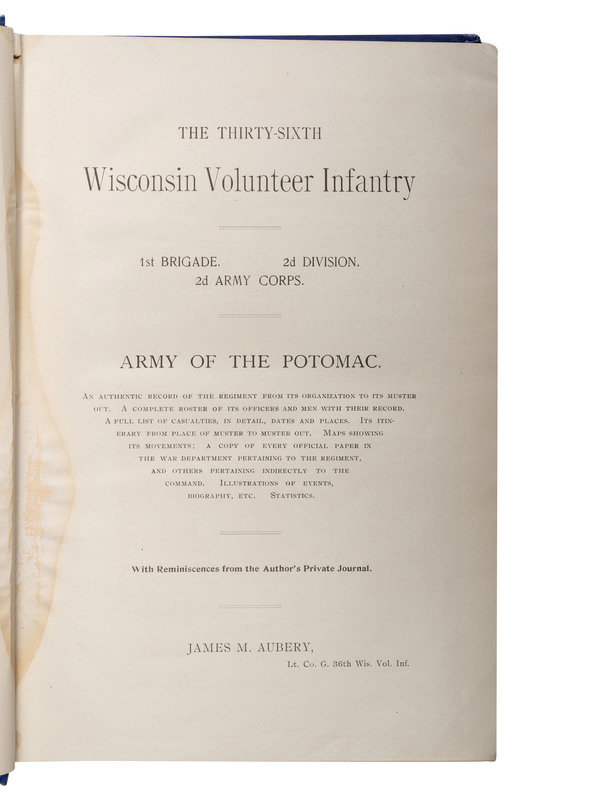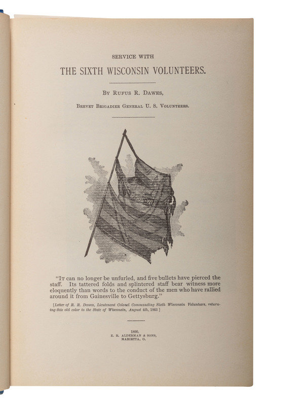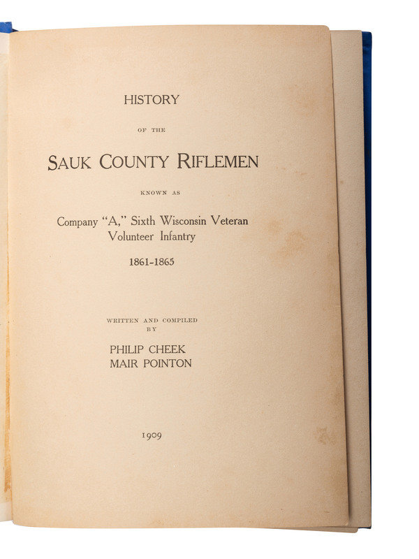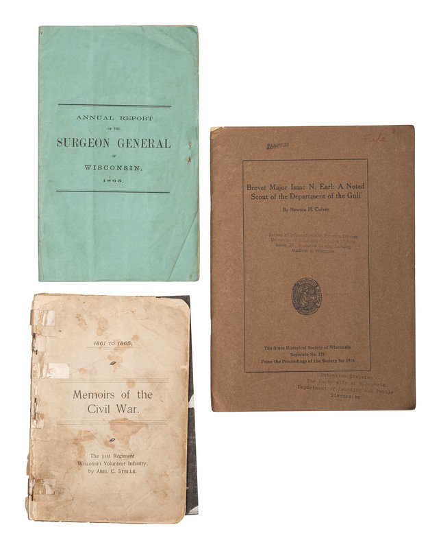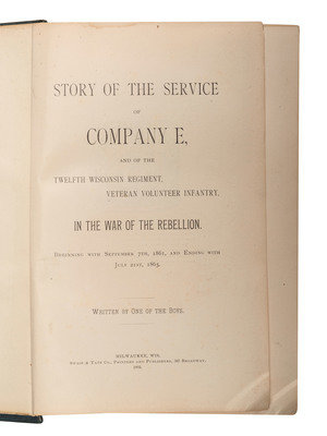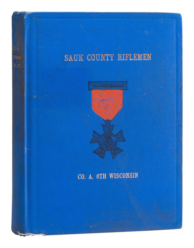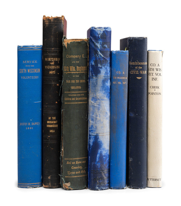 CHEEK, Philip and Mair Pointon. History of the Sauk County Riflemen Known as Company "A," Sixth WIsconsin Veteran Volunteer Infantry. [Madison, WI]: [Democrat Printing Company], 1909. -- AUBERY, James M. The Thirty-Sixth Wisconsin Volunteer Infantry, 1st Brigade. 2d Division. 2d Army Corps. Army of the Potomac. [Milwaukee?]: Fantine Aubery McCleary, 1900. (Dampstine affecting gutter and spine). Provenance: University of Kentucky Library (library markings). -- [ROOD, Hosea W.]. Story of the Service of Company E, and of the Twelfth Wisconsin Regiment, Veteran Volunteer Infantry. Milwaukee, WI: Swan & Tate Co., 1893. -- DAWES, Rufus R. Service with the Sixth Wisconsin Volunteers. Marietta, OH: E.R. Alderman & Sons, 1890. -- ROOD, Hosea W., compiler. Wisconsin at Vicksburg: Report of the Wisconsin-Vicksburg Monument Commission Including the Story of the Campaign and Siege of Vicksburg in 1863 with Especial Reference to the Activities Therein of Wisconsin Troops. Madison, WI: [Wiconsin-Vicksburg monument Commission], 1914. -- And 5 others. Together, 10 works in 10 volumes, all FIRST EDITION, 8vo, all in publisher's bindings, except for STELLE, Abel C. Memoirs of the Civil War. (Disbound.), condition generally very good, except as noted.