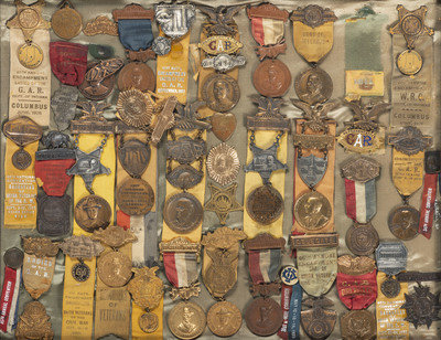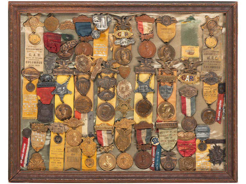 [CIVIL WAR - GRAND ARMY OF THE REPUBLIC]. A large framed collection of GAR and auxiliary organization medals and badges, including: