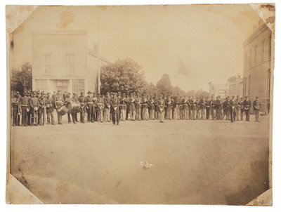 Albumen photograph, ca late 1860s or after, appears to be reunion of armed GAR veterans just after the Civil War. Approx. 7-1/2 x 10 in. With it is a negative of the same image with a number of people and places labeled: The Band; P.O. & News Depot; Flag and Flag Bearer; Restaurant; Photographer's store; Hotel; and "Dirt Village Square (cart tracks visible in original picture)."