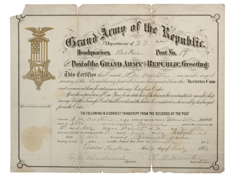 [With:] 2 Grand Army of the Republic Transfer Card Certificates. Each approx. 9 x 11-1/2. One for Wm. Morton who served 3 years in the 31st Wis. Vols. verifying that he is a member in good standing of the Parker Post No. 17, and recommending him for admission to any Post. 17 May 1886. The second for Silas Yates, 3rd MO Cav., a member in good standing of the Sheridan Dix Post No. 7. 2 June 1913.