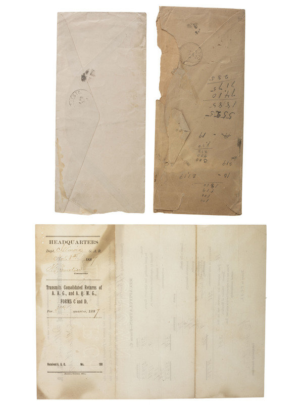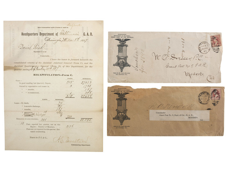 [With:] 2 GAR envelopes to Modesto, California, c. 1893. Business-sized envelopes with GAR logo on left side. Both to "Grant Post No. 9" in Modesto.