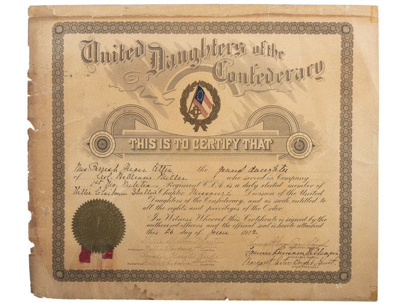 [With:] United Daughters of the Confederacy membership certificate from 1922. 12 x 14-1/4 in. Certifying Mrs. Parrish Geiger Etter is the grand-daughter of Col. William Miller, 1st MO militia. (darkened, water stains)