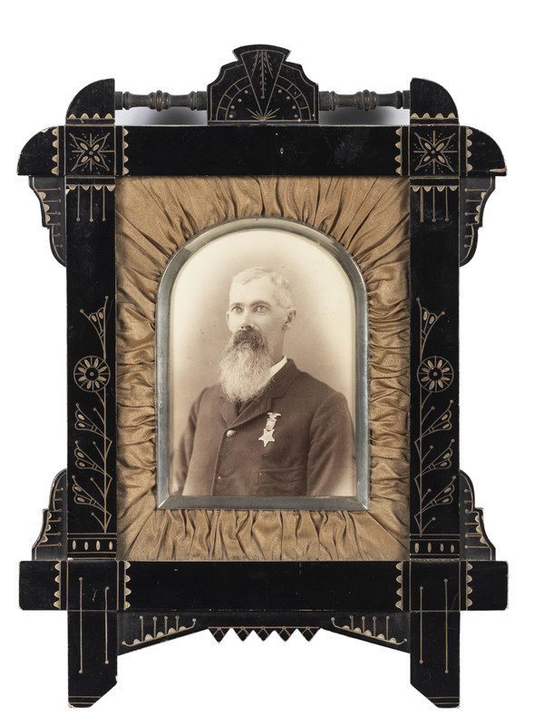 [With:] Grand Army of the Republic Veteran photo in fancy frame. Shows veteran with GAR button and membership badge. Photo max. 4 x 5-1/2 in. Max. frame approx. 10 x 14 in.