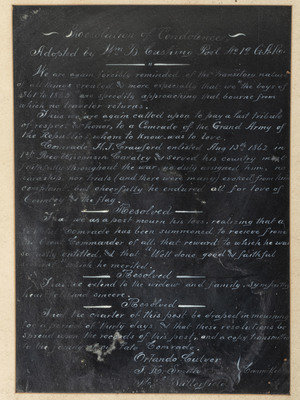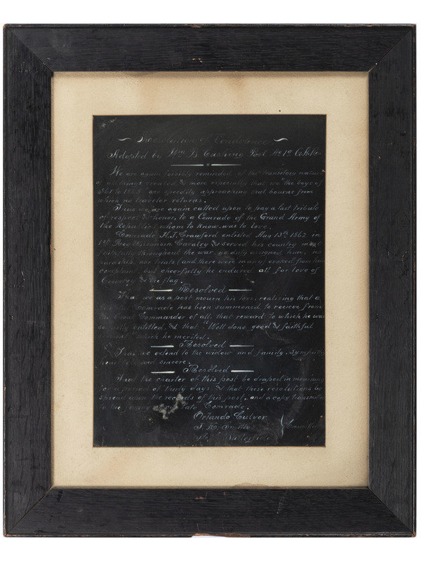 [With:] GAR declaration of mourning from Cushing Post #19. Written in white ink on blank background. 9-1/2 x 13-1/2 in. (sight) Complete in frame 17 x 20-3/4 in. In honor of H.J. Crawford, enlisted 13 Aug. 1862 in the 1st Reg. Wis. Cav. "Well done good and faithful servant."