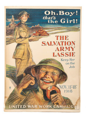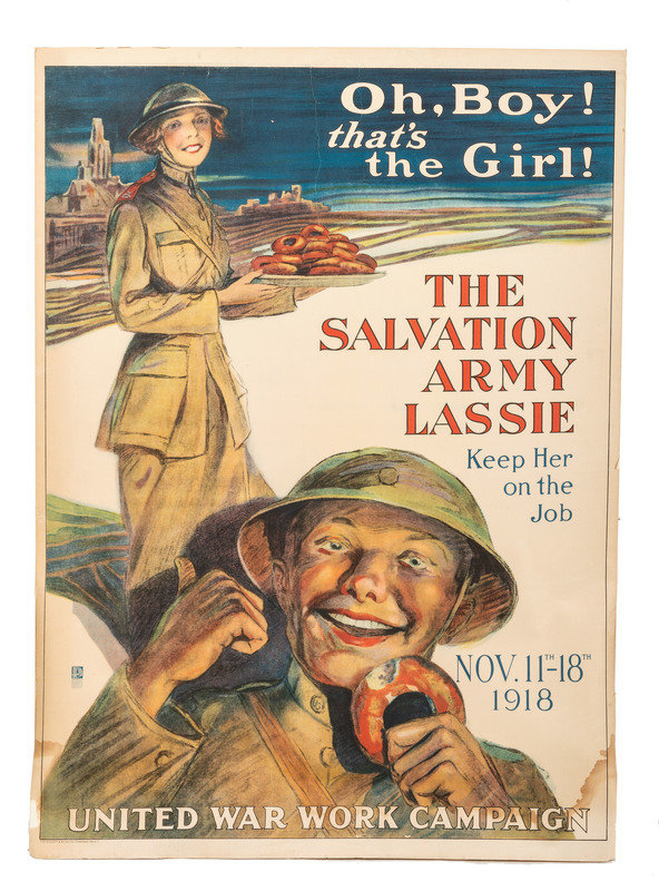 29 x 40 in. poster mounted on board (bottom third heavily dampstained causing warping and poster separation from board, also with scattered creasing, small tears at edges). A young woman in uniform carrying a tray of doughnuts, and a soldier with a doughnut gesturing towards her approvingly.
