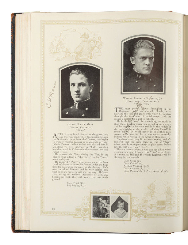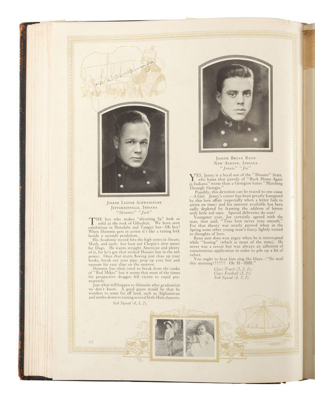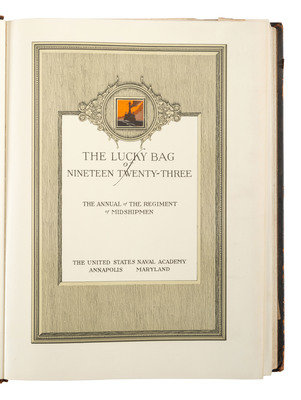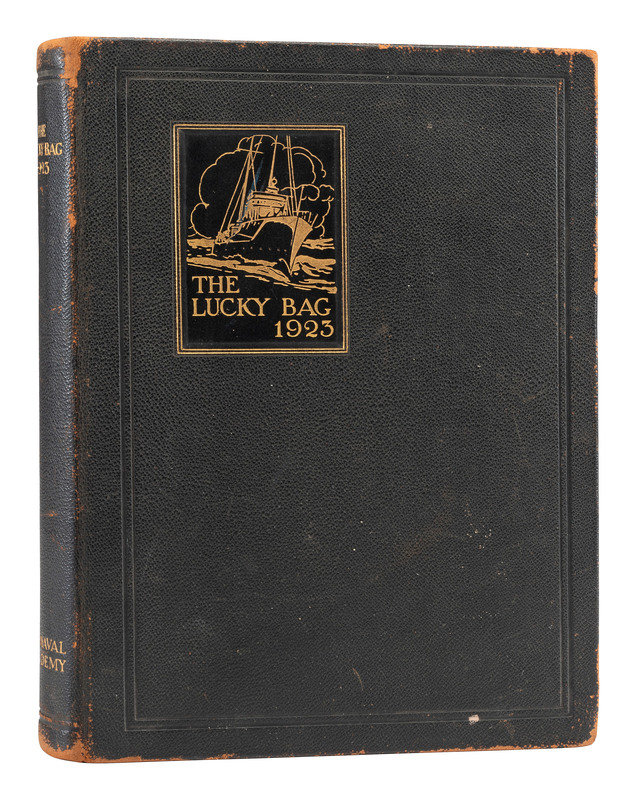 The Lucky Bag 1923: the Annual of the Regiment of Midshipmen United States Naval Academy. 4to, black cloth, top edge gilt, 482, lxi pp. This copy belonging to J.B. [Joseph Bryan] Renn (bio. p.192). [Zimmerman's (above) bio. is on p. 122] At least 50 midshipmen signed their bios. in Renn's copy of the yearbook. One of Renn and Zimmerman's classmates was Arleigh Burke, for whom a class of destroyers is named.