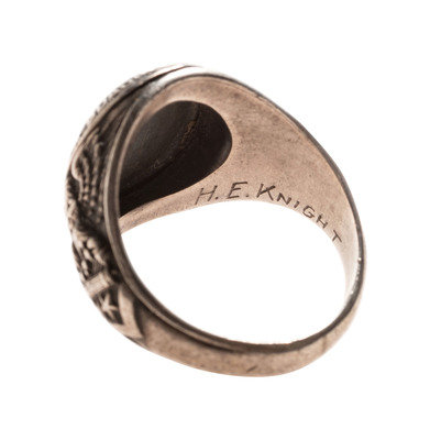 Ring with “Black Cat Command / Guadalcanal” flanked by eagles on each side. Inside engraved “H. (Harry) E. Knight.” Another stamp unreadable, probably “sterling.” Ca 1943.