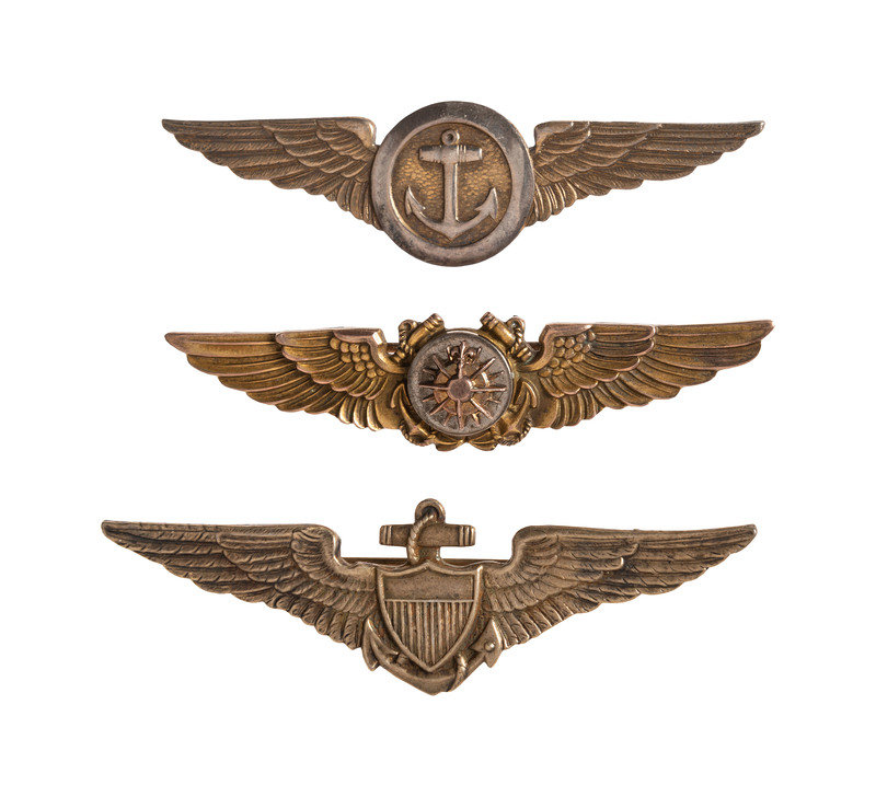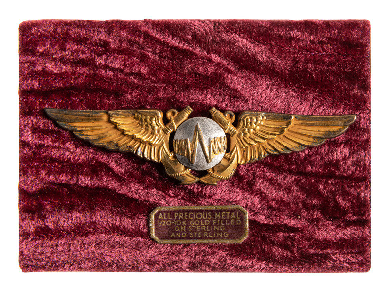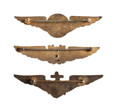 [With:] WWI pilot's wings, gilt sterling, 2 7/8 in. Shield over anchor over wings.
