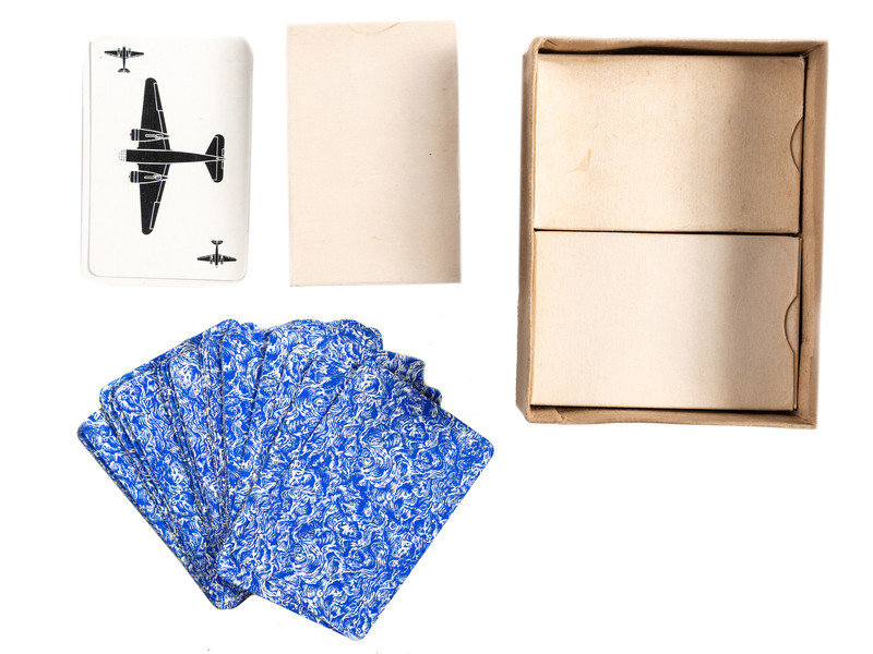 Cards with “Reprint July, 1941.” Original box with four packs of cards (some scuffing, but intact). Only the blue pack has been opened; the other three still have their glassine wraps inside the deck box. Also still has all 4 keys to blue, green, red and orange packs.