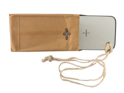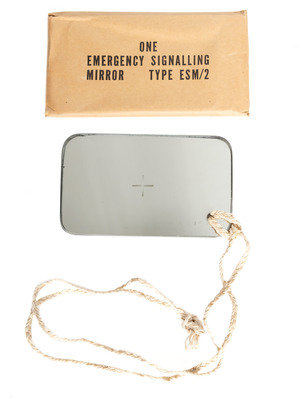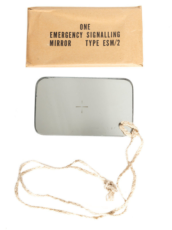 Mirror still in its wrapper: “One Emergency Signalling Mirror Type ESM/2.” With braided neck strap/lanyard.
