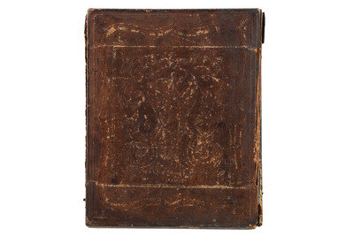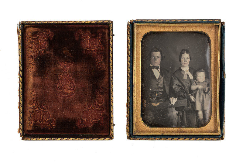[With:] Half plate daguerreotype portrait of a young husband, wife, and child sitting uncomfortably against a simple backdrop, their cheeks lightly tinted pink. The man holds what appears to be a level suggesting that he may be a carpenter (very good clarity and contrast, few spots on plate, tarnish to perimeter). Housed in full case (fully separated at hinge, with surface wear and some damage).