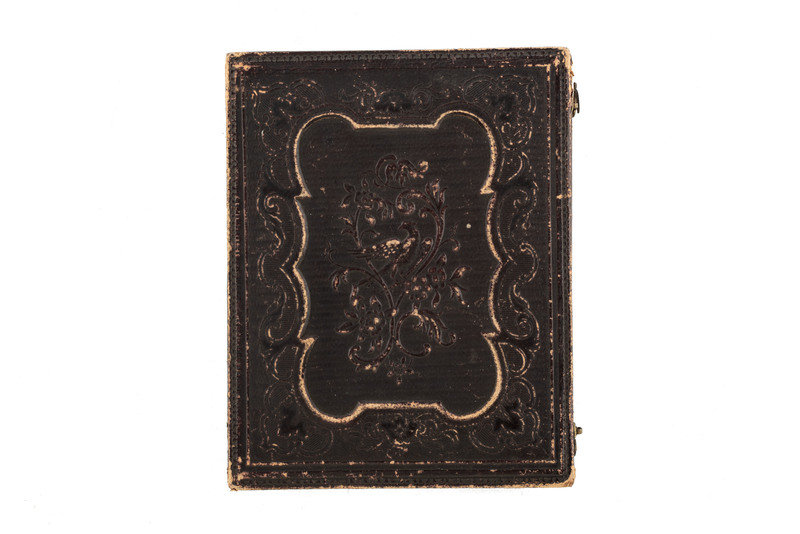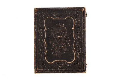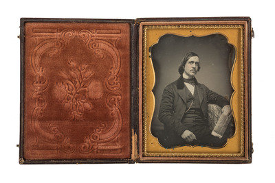 Quarter plate daguerreotype portrait of a pensive looking gentleman, almost certainly a lawyer, holding what appears to be a bundle of folios, possibly deeds to be recorded at the clerk of courts office (strong clarity and contrast, small spot near right edge, light tarnish to perimeter). Housed in full case (some surface wear, loss to top edge of back cover).