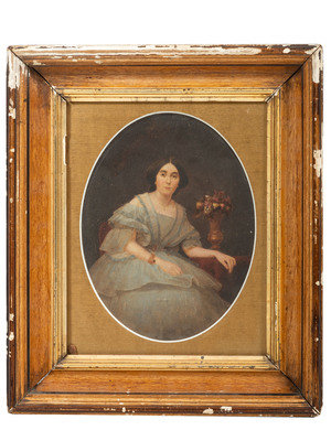 [With:] JACOBS, E., photographer. 6 1/2 x 8 1/2 in. portrait of a lovely woman seated beside a bouquet of flowers, housed under mat in wood frame, 11 3/4 x 13 3/4 in. (chipping to frame, unexamined outside frame). With E. Jacob's partial label on back of frame, which reads in part, "Jaco[bs] / Daguerreotyp[e] / Saloon / 93 Camp St. / Ne[w] [Or]leans." The "93 Camp St" address is also scratched into the frame backing.