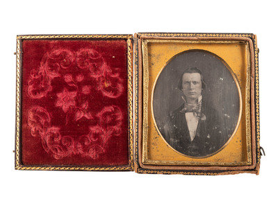 MOISSENET, Francois, photographer. Sixth plate daguerreotype of subject possibly identified as Sheriff Daniel of West Feliciana Parish. New Orleans, LA: n.d. (Surface abrasions, occasional spotting.) Housed in half pressed paper case (somewhat discolored, with mismatched half case). Photographer's "F. Moissenet" stamp on brass mat.