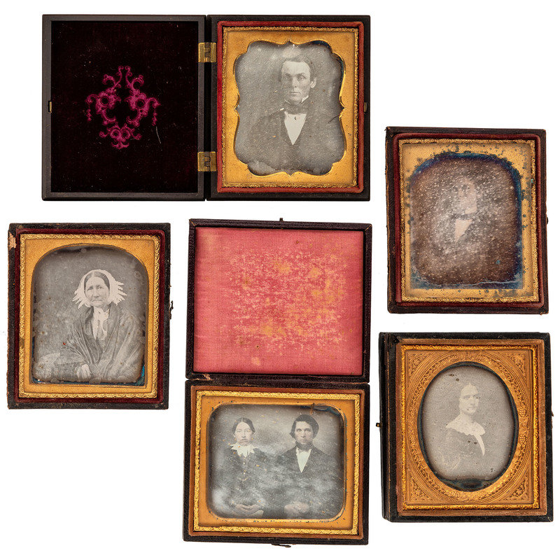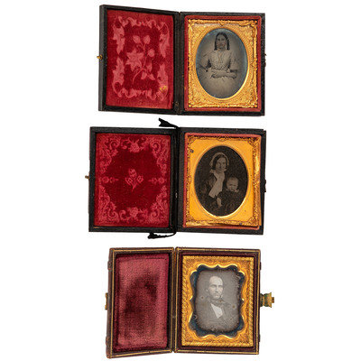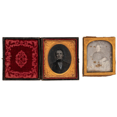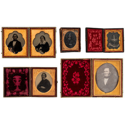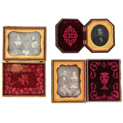 Quarter plate daguerreotype portrait of a young couple. N.p.: n.p., n.d. (Tarnishing to edges, some fading, and light spotting.) Housed in a pressed paper case (fully separated at spine, with surface wear throughout). -- Quarter plate daguerreotype of two women, likely mother and daughter. N.p.: n.p., n.d. (Tarnishing to edges, with spotting throughout.) Housed in a leatherette (fully separated at spine, with surface wear throughout). -- A pair of sixth plate tintypes featuring the same man wearing the same smirking facial expressing, captured from different angles. N.p.: n.p., n.d. (Darkening to images, with some crackling to emulsion and spotting to image in octagonal case; both unsealed.) Housed in a regular pressed paper case and an octagonal union case with geometric design (paper case fully separated at spine, both with heavy soiling and some surface wear throughout). -- A sixth plate daguerreotype portrait of a young woman with her arm resting on a book and holding what appears to be a cased image in her hand. N.p.: n.p., n.d. (Tarnishing to edges, with heavy clouding and large spots to image.) Housed under glass only, in original seal. Loose mat). -- And 14 others, including one quarter plate daguerreotype, 5 sixth plate daguerreotypes, 3 sixth plate ambrotypes, one ninth plate daguerreotype, 3 ninth plate ambrotypes, and one ninth plate tintype.