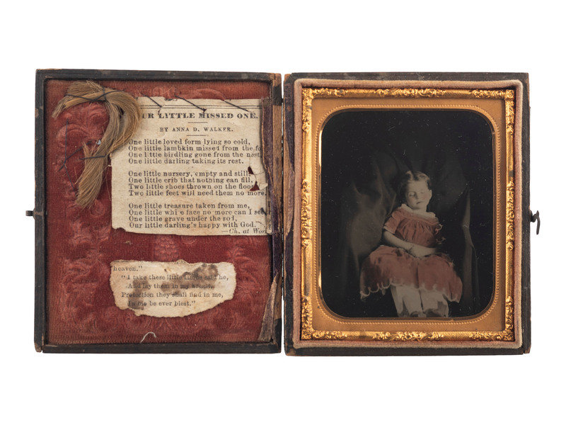 Sixth plate hand-tinted ambrotype. (Some darkening). Housed in full pressed paper case with a floral motif (hinge split, scuffs). Interior has a lock of the subject's hair sewn to the velvet pad alongside two clipped poems on the subject of death.