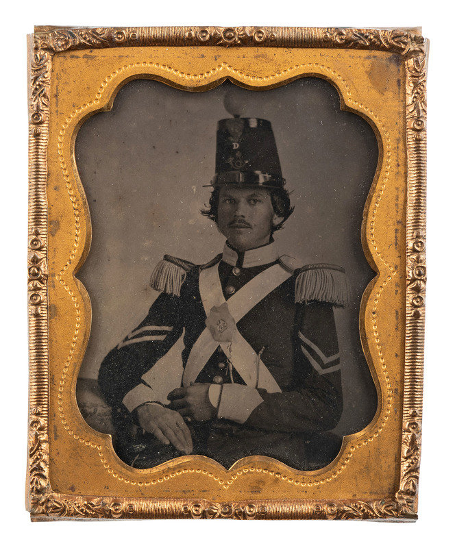 A half-length seated studio portrait of a young mustachioed officer wearing crossed white shoulder belts with a plaque connected to a fob. He wears dress epaulettes and corporal chevrons. his shako with pom features an infantry badge and company "D" designation.