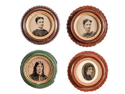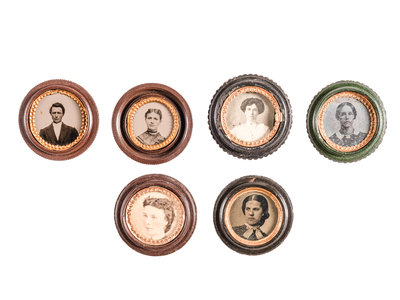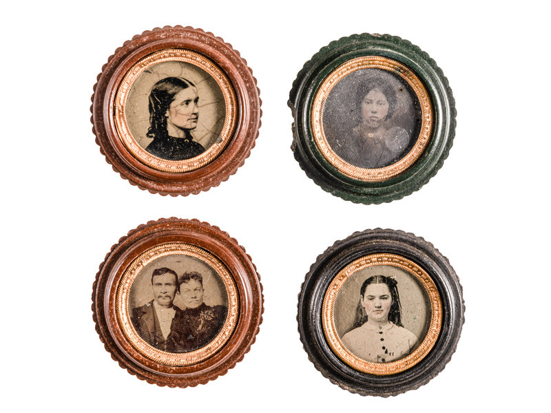 Cases contain images of women and couples, including a tintype portrait of a couple posed with their heads touching (crazing, darkening to image) [3-513Mt2]; a pair of crisp tintype portraits of a man and woman housed in either side of the same case [3-496t2]; and a tinted albumen headshot portrait of a lovely woman by J. Taylor, New York. Taylor's imprint on verso [3-556].