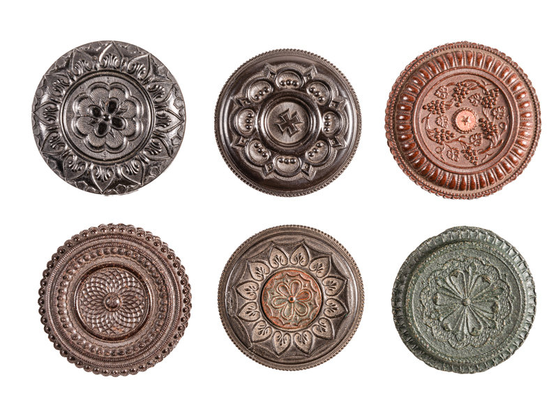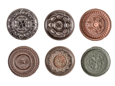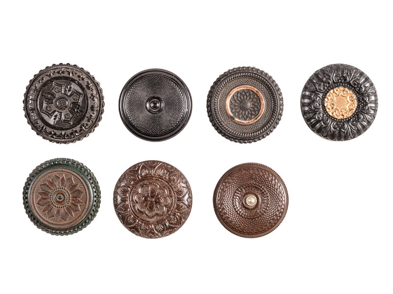 A Very Very Rare floral example with gilt detail at center, Grape Bunches [2-123G] (significant chipping with some edge loss, gilt detail faded on lid); a Very Rare geometric example with brown enamel at center [3-530E] (chipping with loss to base edge, surface soil throughout, some discoloration and possible repair to lid surface); 2 Very Rare geometric examples [3-514, 3-543a (heavy wear including significant chipping and surface deterioration)]; 8 Rare examples [3-557G, 3-536G, 3-556, 3-556, 3-539, 3-509G, 3-497, 3-555]; and one Scarce example with zinc embedded at center [3-505]. Conditions vary, though many include some light to moderate soiling and surface wear.