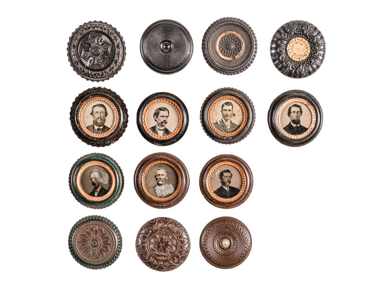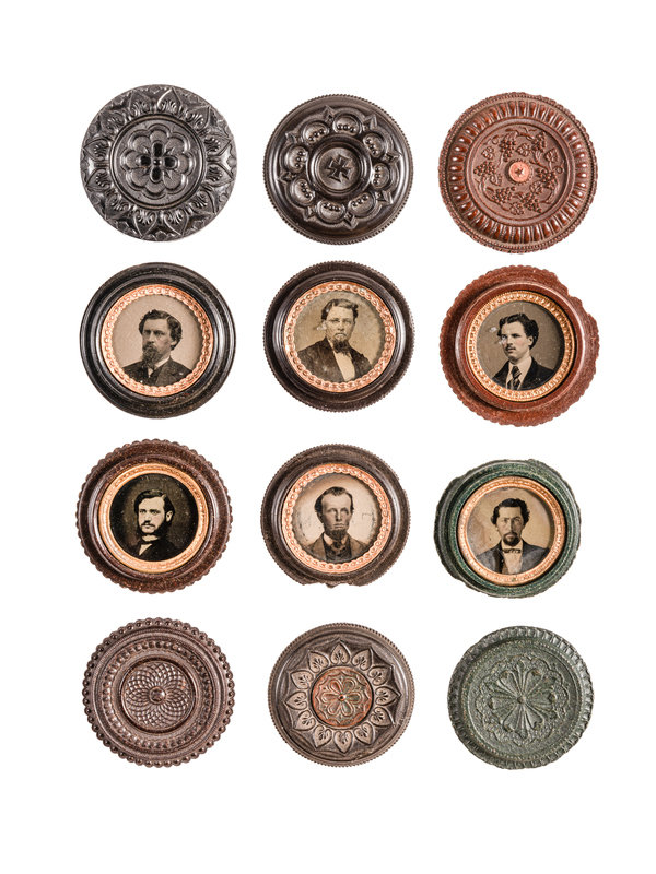 [EARLY PHOTOGRAPHY - UNION CASES]. A group of 13 assorted "oreo" cases containing tintype portraits of men with facial hair.