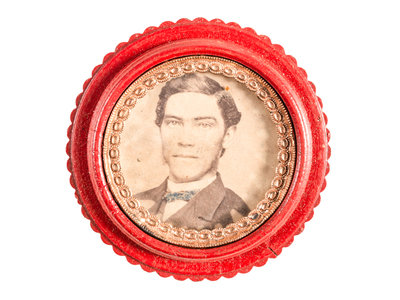 Cases contain tintype and paper portraits of men and women, and one tintype portrait of a baby [3-525a], including a paper portrait of a young man with ink inscription on verso reading, "Perry Manly brother of Mrs. Elizabeth Everhard He died Sept 1868. Buried in Warsaw [indecipherable]" [3-499a].