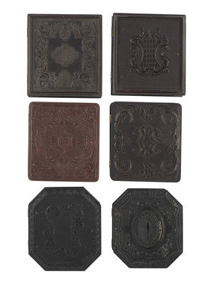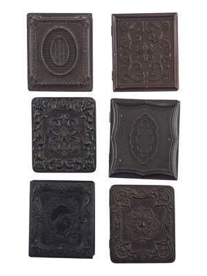 2 quarter plate [Berg 3-37, 3-43]. 8 sixth plate cases [1-86 Stained Glass Window, 3-118, 3-126, 3-127, 3-175, 3-195, 3-203, 3-221], 8 ninth plate cases [Berg 1-149 Scythe Cutting Grain, 2-109 Bunch of Flowers, 3-235, 3-321, 3-328, 3-319R, 3-340, and a ninth plate, square version of 3-205], and 2 sixteenth plate cases [Berg 3-479, 3-483]. -- Together, 20 thermoplastic union cases, most containing images, condition generally very good.