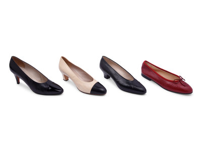 Beige leather pumps with black leather toe. Dust bag and box included.