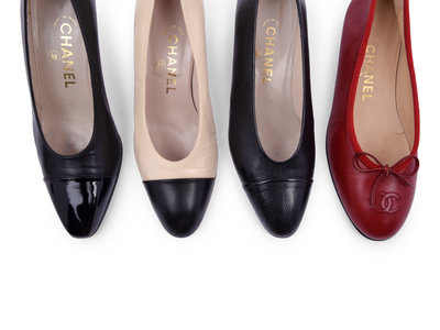 Red leather ballet flats with stitched CC logo on toe and leather tied bow on top vamp. Dust bag and box included.