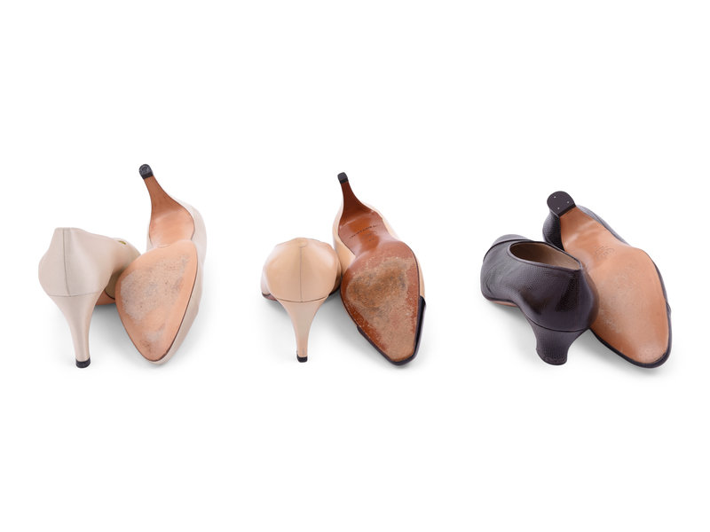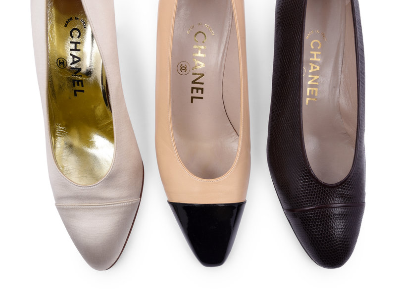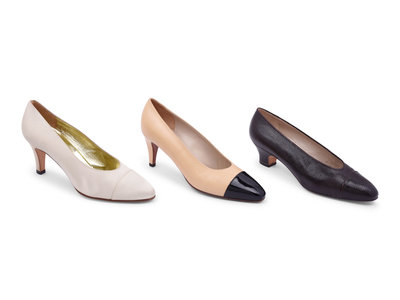 Beige leather pumps with black patent leather toes. Dust bag and box included.