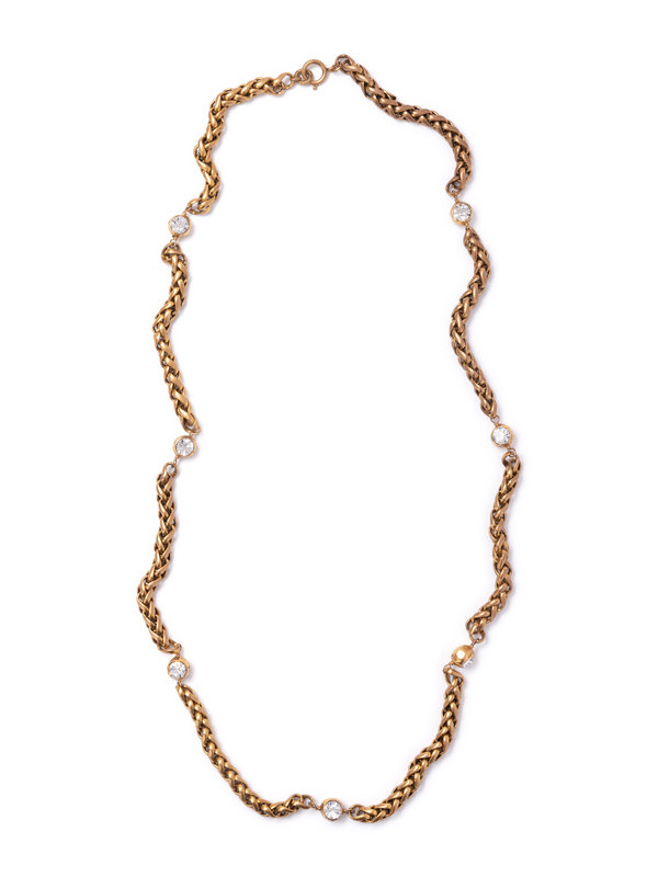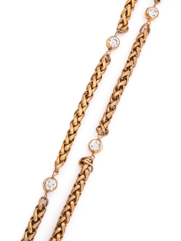 Antique gold-tone braided chain necklace with clear faceted rhinestones.